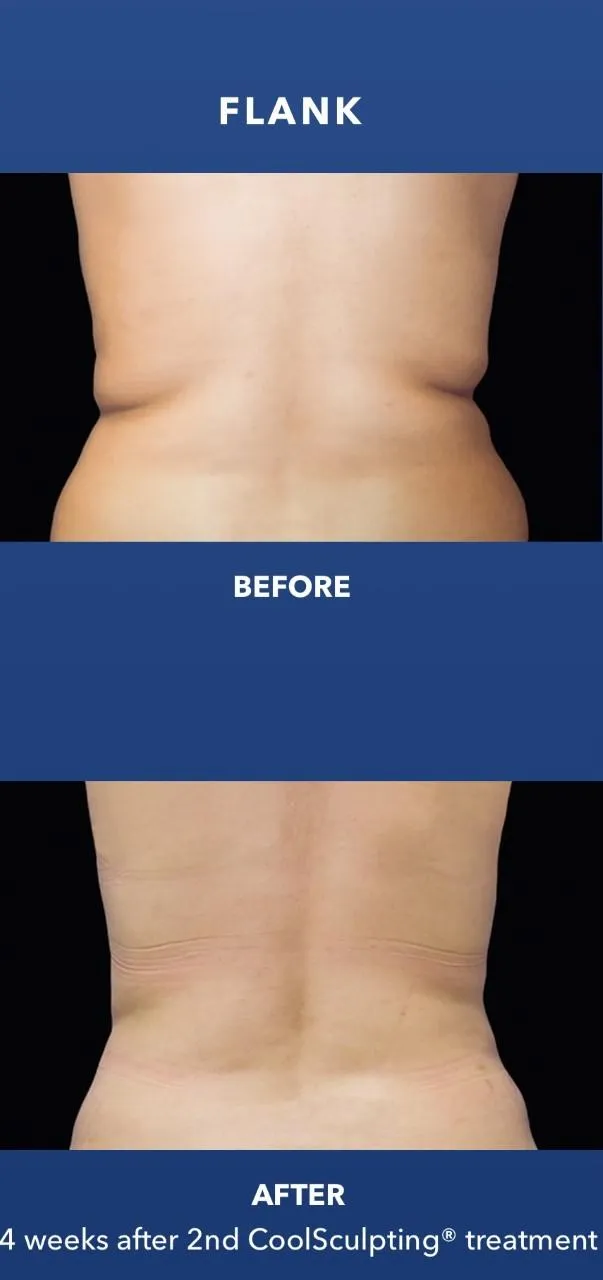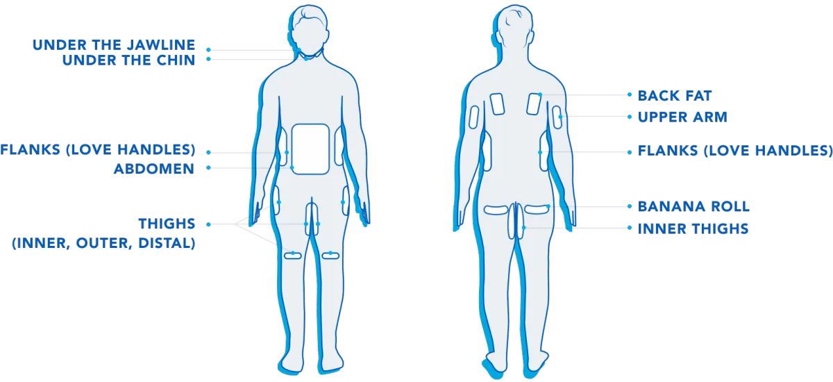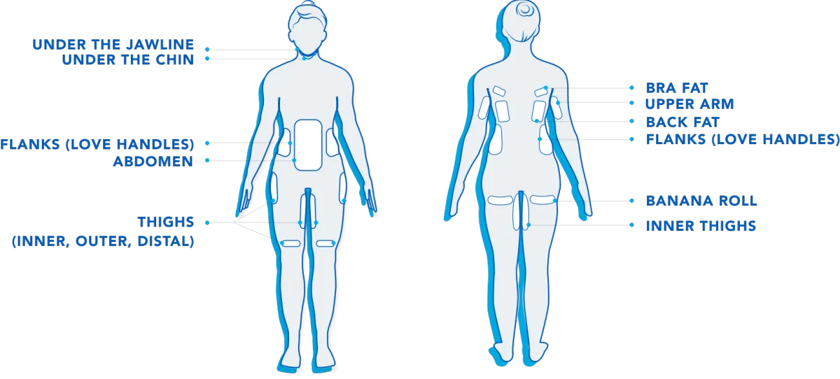 CoolSculpting® is cleared to eliminate stubborn fat under the jawline, under the chin, the upper arms, back fat, bra fat, the flank area (love handles), abdomen, thighs, and under the buttocks (banana roll).